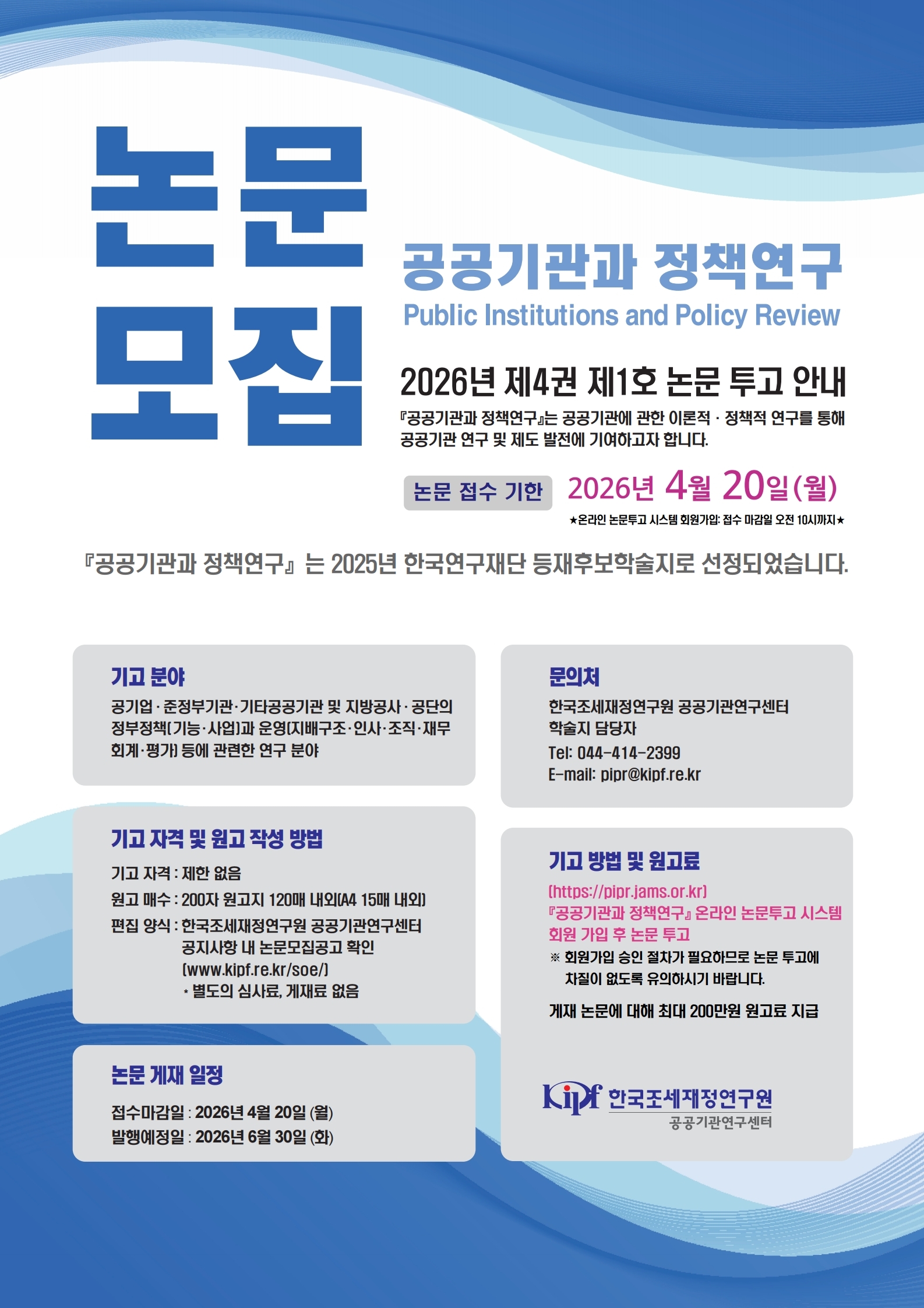 - 접수 방법: 「공공기관과 정책연구」 온라인논문투고시스템(https://pipr.jams.or.kr)에 회원가입 후 논문 투고