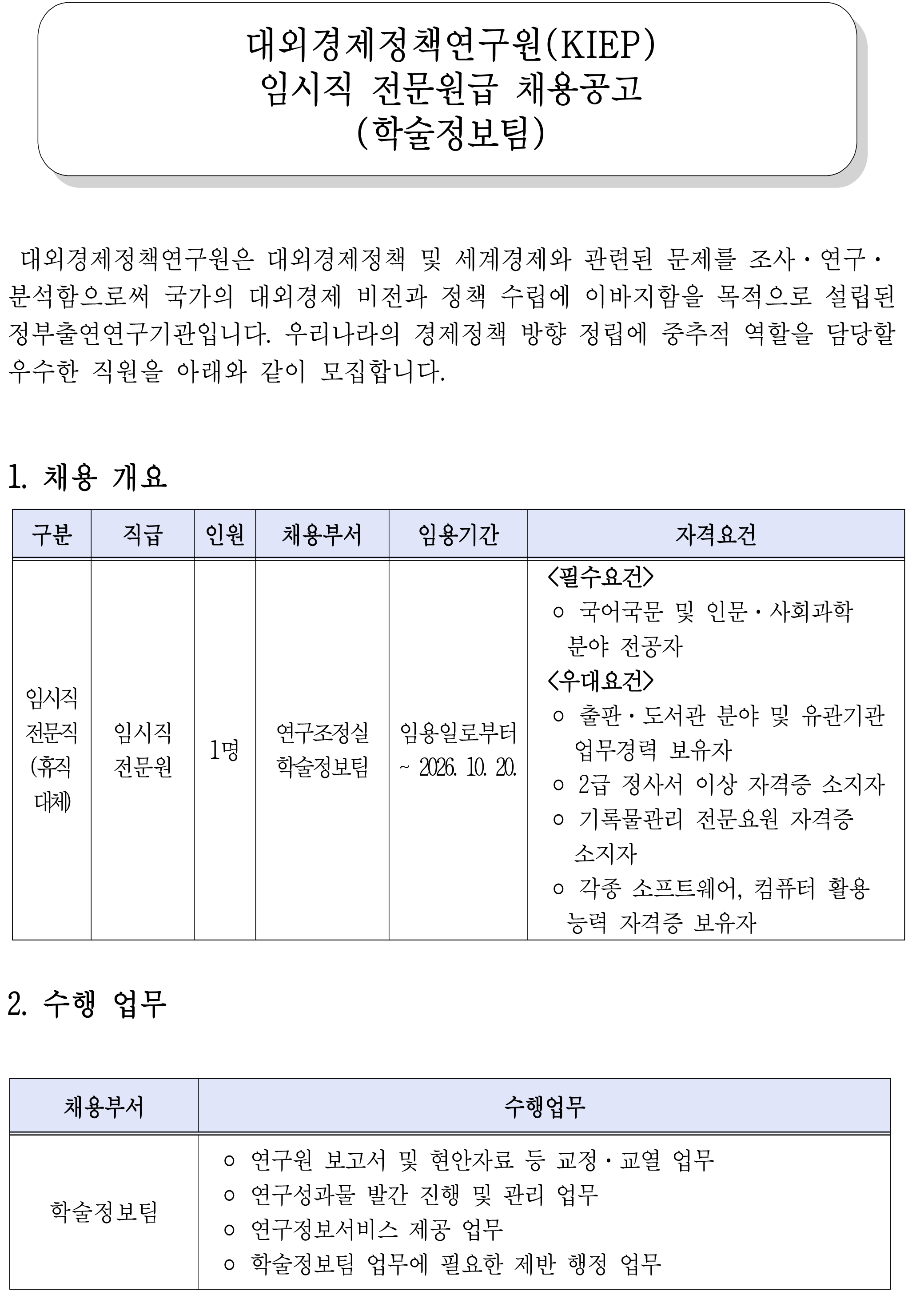 [대외경제정책연구원] KIEP 임시직 전문원급 채용 공고 (학술정보팀)