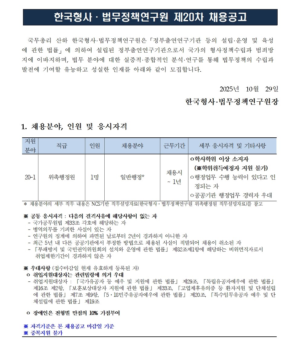한국형사·법무정책연구원 2025년도 제20차 채용공고 [위촉행정원] 등록일2025-10-29 연구기관 바로가기 2025년도 제20차 채용공고(위촉행정원)_최종.pdf 한국형사법무정책연구원 위촉행정원 직무설명자료.pdf
