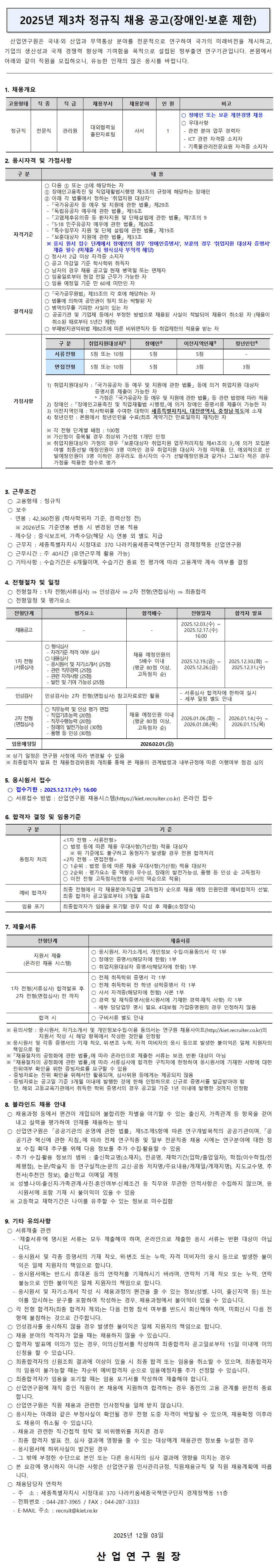 [산업연구원] 2025년 제3차 정규직 채용공고 등록일2025-12-03 연구기관 바로가기 2025년 제3차 정규직 채용공고.pdf 산업연구원 사서 분야 채용 직무기술서.pdf 채용 이의신청서.hwp