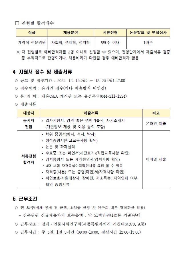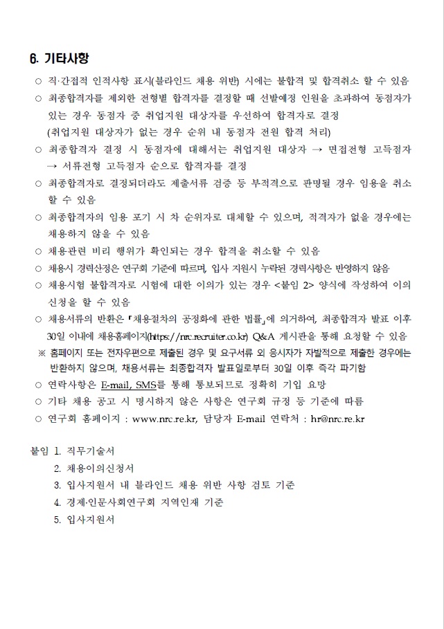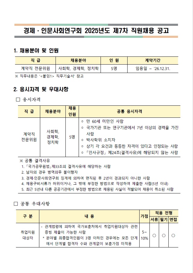 2025년도 제7차 직원채용(계약직 전문위원) 등록일2025-12-15 연구기관 바로가기 (붙임1) 직무기술서.pdf (붙임2) 채용 이의신청서.pdf (붙임3) 입사지원서 내 블라인드 채용 위반 사항 검토 기준.pdf (붙임4) 경제․인문사회연구회 지역인재 기준.pdf (붙임5) 입사지원서.pdf (공고) 2025년도 제7차 직원채용 공고(안).pdf