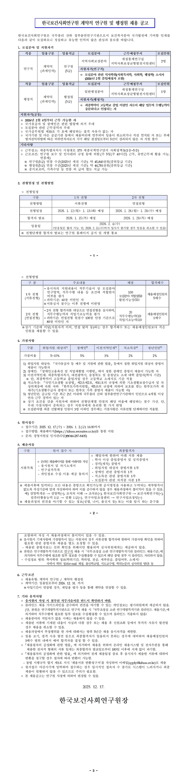 [한국보건사회연구원] 계약직 연구원 및 행정원 채용 공고(재정통계연구실 지역사회보장균형발전지원센터)